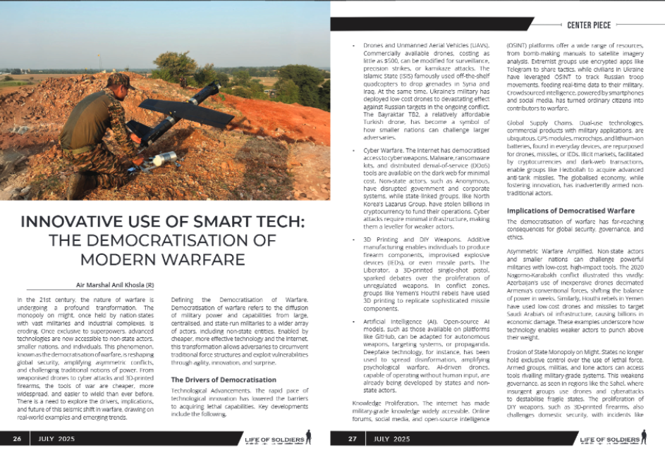 In the 21st century, the nature of warfare is undergoing a profound transformation. The monopoly on might, once held by nation-states with vast militaries and industrial complexes, is eroding. Once exclusive to superpowers, advanced technologies are now accessible to non-state actors, smaller nations, and individuals. This phenomenon, known as the democratisation of warfare, is reshaping global security, amplifying asymmetric conflicts, and challenging traditional notions of power. From weaponised drones to cyber attacks and 3D-printed firearms, the tools of war are cheaper, more widespread, and easier to wield than ever before. There is a need to explore the drivers, implications, and future of this seismic shift in warfare, drawing on real-world examples and emerging trends.