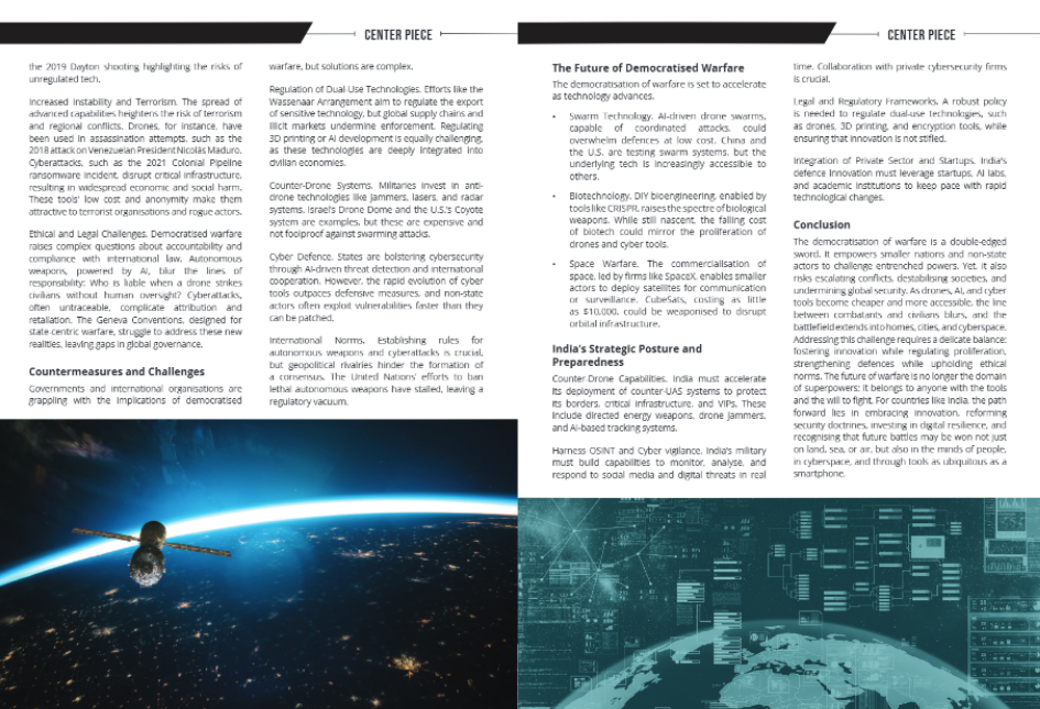 The democratisation of warfare is a double-edged sword. It empowers smaller nations and non-state actors to challenge entrenched powers. Yet, it also risks escalating conflicts, destabilising societies, and undermining global security. As drones, AI, and cyber tools become cheaper and more accessible, the line between combatants and civilians blurs, and the battlefield extends into homes, cities, and cyberspace. Addressing this challenge requires a delicate balance: fostering innovation while regulating proliferation, strengthening defences while upholding ethical norms. The future of warfare is no longer the domain of superpowers; it belongs to anyone with the tools and the will to fight. For countries like India, the path forward lies in embracing innovation, reforming security doctrines, investing in digital resilience, and recognising that future battles may be won not just on land, sea, or air, but also in the minds of people, in cyberspace, and through tools as ubiquitous as a smartphone.